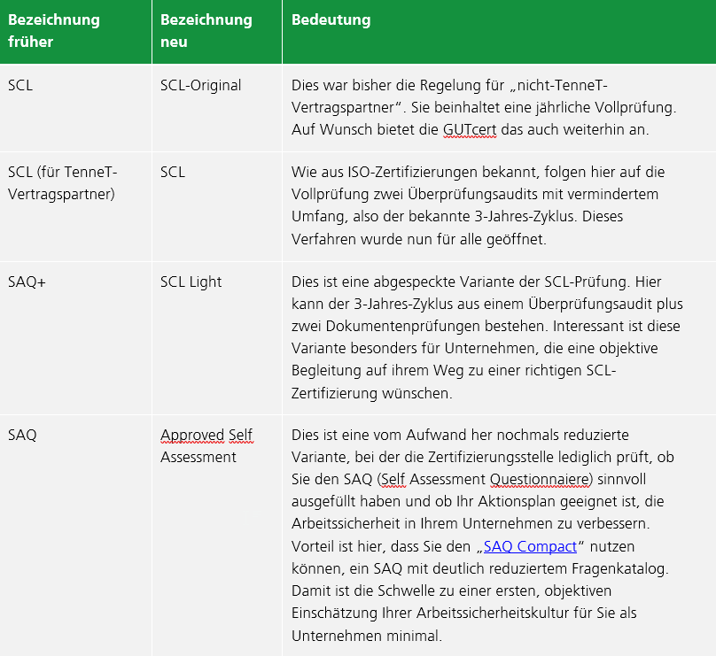 Da besonders TenneT SCL genutzt hat, um sich der Arbeitssicherheitskultur seiner Zulieferer zu versichern, gab es hier zum einen Sonderregelungen, zum anderen war für Außenstehende oft verwirrend, was die unterschiedlichen SCL-Bezeichnungen bedeuten. Hier wird SCL nun eindeutiger: