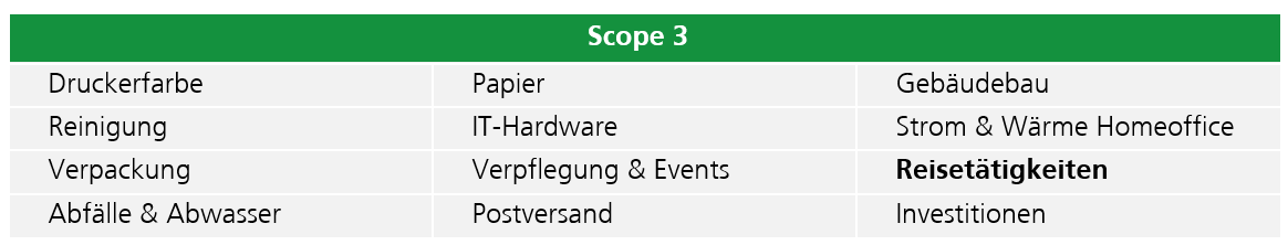 Als Nachweise für die Scope 1-2 Emissionen wurden vorrangig bestehende Abrechnungen aus dem Einkauf verwendet. Für die wesentlichsten THG-Emissionen aus den Reisetätigkeiten (ca. 95% in 2020) wurde eine Analyse einer größeren Anzahl an Reisekostenabrechnungen vorgenommen und über alle Reisen interpoliert – zur weiteren Verbesserung werden ab 2021 alle Reisekostenabrechnungen automatisiert in einer Datenbank erfasst und ausgewertet. Weitere unwesentliche Emissionen aus den anfallenden Abfällen, Abwässern oder der Verpflegung im Rahmen unserer Veranstaltungen sollen perspektivisch eingebunden werden.