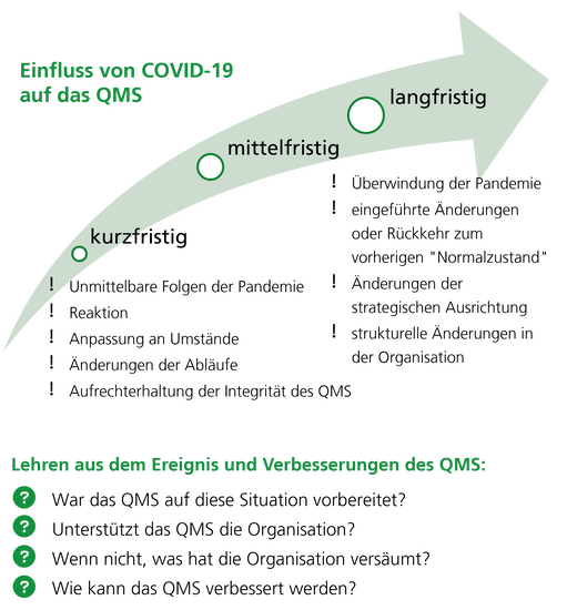 Die APG stellt heraus, dass Covid-19 ein disruptives globales Ereignis ist. D.h. für Organisationen kann es notwendig sein, den bisher betrachteten Kontext auszuweiten, um Trends, neue Märkte, neue Produkte oder verschiedene Anwendungen der Produkte und Dienstleistungen mit zu berücksichtigen. Organisationen können aus dieser Betrachtung den Einfluss dieser Veränderungen auf ihr QMS auf verschiedenen Zeitachsen betrachten.