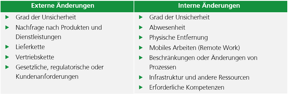 In ihrem Leitfaden betrachtet die APG weitere Aspekte, die im QMS berücksichtigt werden müssen, bspw. welchen Einfluss Probleme externer Dienstleister auf die Leistungserbringung einer Organisation haben können. Aber auch sich ergebende Änderungen bei Ressourcen wie Arbeitsumgebung und Infrastruktur durch mobiles Arbeiten (Remote Work) werden genannt. Mobiles Arbeiten und andere neue Anforderungen können bei den Mitarbeitenden neue Kompetenzen erfordern.