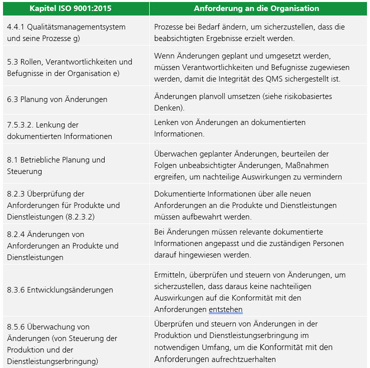 Insbesondere das Kapitel 6.3 Planung von Veränderungen gibt vor, dass Organisationen Veränderungen planen sollen und was dabei zu beachten ist. Aber der Umgang mit Veränderungen wird auch an verschiedenen Stellen der ISO 9001 adressiert.