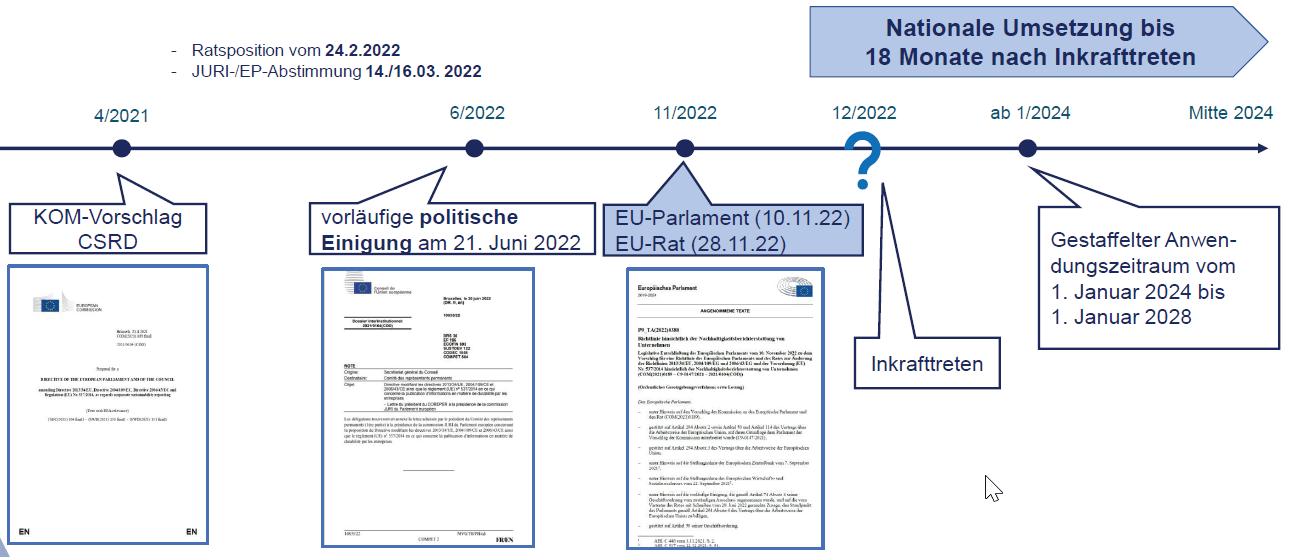 Das zweite, abschließende Set soll im Sommer 2023 verabschiedet werden. Damit werden die CSRD-Berichtsinhalte vollumfänglich definiert und die Übergangsfrist von 2024 bis 2028 beginnt.