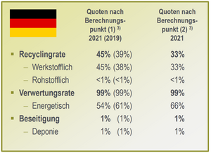 Durch die neue Berechnungsmethode sinkt die Recyclingrate zwar zunächst von 45% auf 33% und die Energetische Verwertungsrate steigt von 54% auf 66%. Allerdings ist die Recyclingrate seit 2019 gestiegen und die energetische Verwertung gesunken.