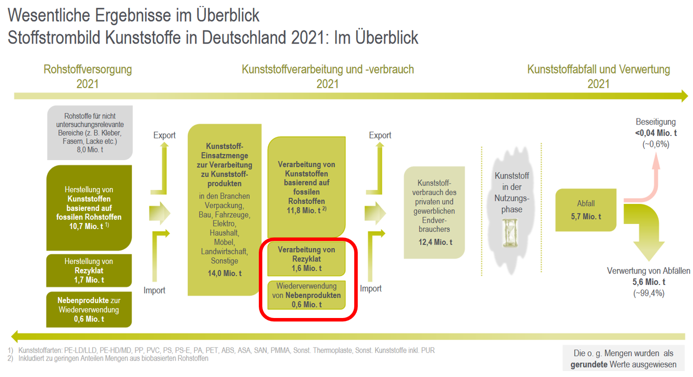 Kunststoffrecycling und insbesondere der Einsatz von Kunststoffrezyklaten haben sich als wesentlicher Bestandteil der Kunststoffbranche und der Rohstoffversorgung in Deutschland etabliert. Insbesondere durch den Einsatz von Kunststoffrezyklat in Produkten reduziert sich der Bedarf an primären Rohstoffen. Kreislaufwirtschaft trägt so zur Schonung von Ressourcen bei und stellt zudem die Rohstoffversorgung sicher. Basierend auf der ermittelten Menge für Rezyklat und der Wiederverwendung von Nebenprodukten von 2.287 kt ergab sich im Jahr 2021 ein Anteil von 16,3% an der gesamten Verarbeitungsmenge (siehe Darstellung).