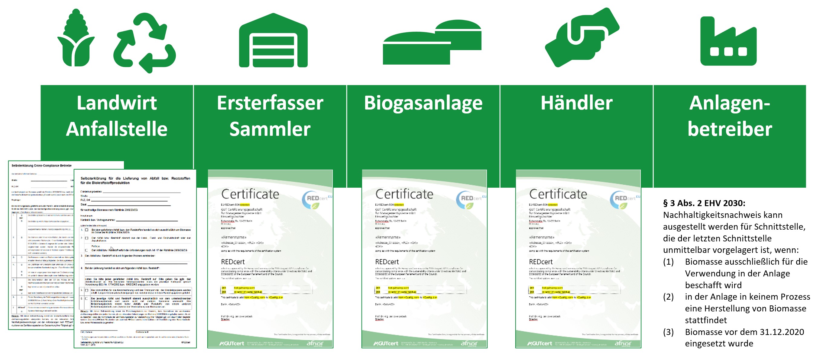 Damit Emissionen aus Biomasse weiterhin mit Null bilanziert werden können, muss die Biomasse als nachhaltig anerkannt sein. Dazu müssen die Einsatzstoffe der gesamten Vorkette mit einem von der EU-KOM anerkannten Zertifizierungssystems zertifiziert sein, wie z.B. SURE, ISCC oder REDcert. Zur Vorkette gehören unter anderem Ersterfasser (Sammler), Händler oder Biomethananlagen, die in das Erdgasnetz einspeisen. Transporte fallen nicht darunter, wenn das Transportunternehmen nicht im Besitz der Einsatzstoffe ist.