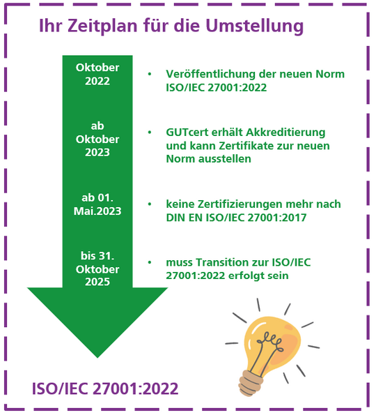 Die Revision der ISO/IEC 27001 wurde im Oktober 2022 veröffentlicht. Darauf muss innerhalb der nächsten 3 Jahre die Umstellung des Zertifikates zur ISO/IEC 27001:2022 erfolgen. Die GUTcert unterstützt Sie auf dem Weg zum neuen Zertifikat.