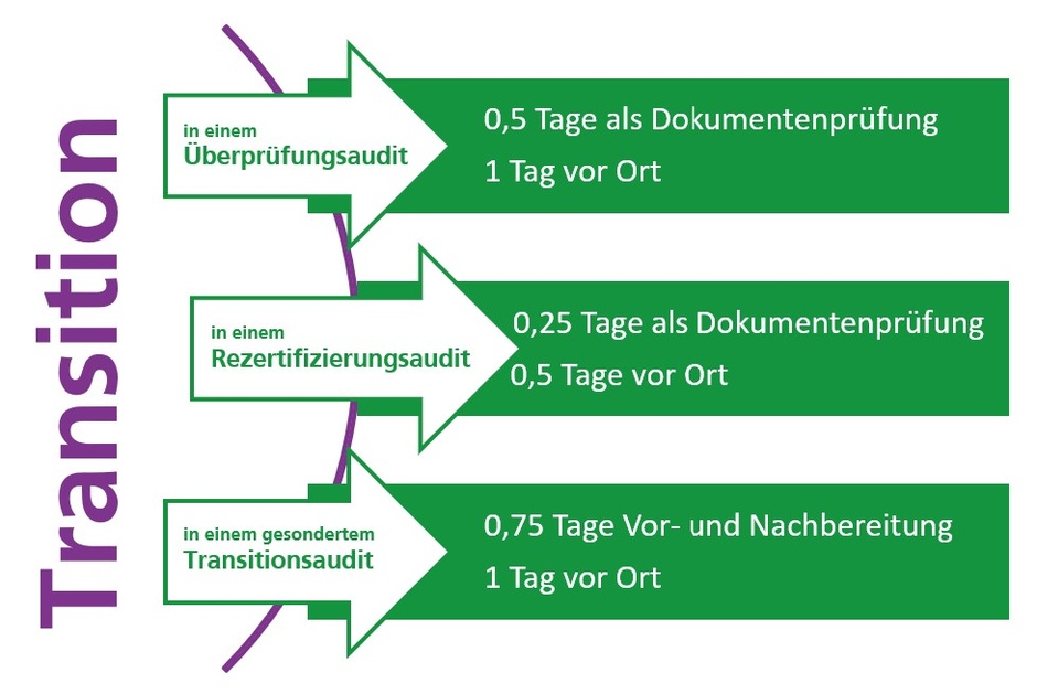 Mit Stichtag zum 31.10.2025 muss ein Übergangsaudit, ein sog. Transition-Audit durchgeführt worden sein. Diese Prüfung kann im Rahmen des regulären Überprüfungs- bzw. Rezertifizierungsaudits geschehen oder auch in einem Sonder-Audit stattfinden.