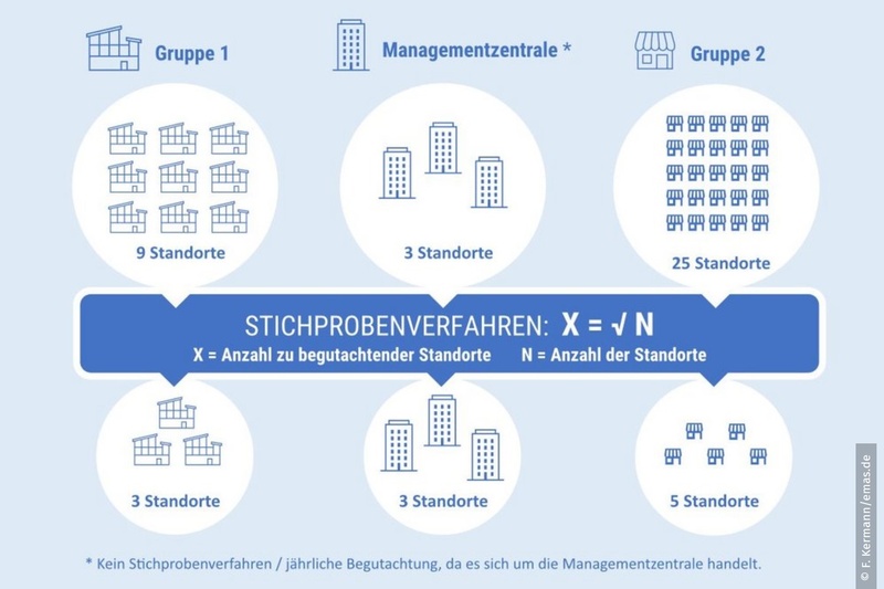 Die Stichproben innerhalb der Cluster sollten so ausgewählt werden, dass der Umweltgutachter einen repräsentativen und umfassenden Überblick in die Umweltleistung der Organisation erhält. Bei der Auswahl der zu begutachtenden Standorte sind diverse Faktoren zu berücksichtigen. So sollten die Standorte beispielsweise gleichartig in Bezug auf ihre Größe, Tätigkeit, Prozesse, Umweltaspekte oder Komplexität sein. Die Stichprobengröße für jede Gruppe bzw. Cluster wird separat ermittelt. Zudem muss die Zentrale immer separat betrachtet werden.