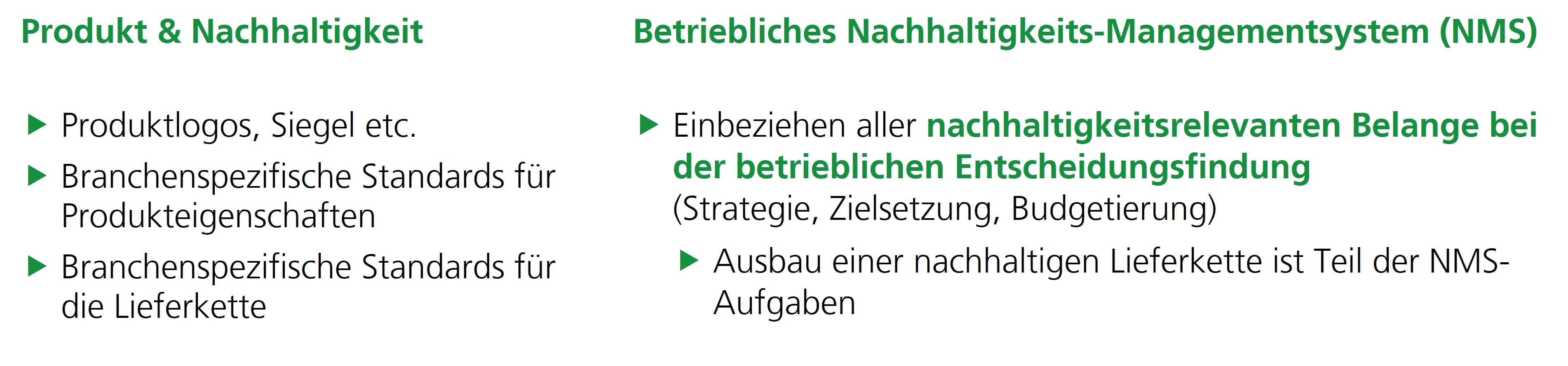 Auf Unternehmensebene geht es um den Aufbau eines Nachhaltigkeitsmanagementsystems (NMS), das verschiedene nachhaltigkeitsrelevante Themen bündelt, in die gelebten Prozesse integriert und so die Risiken für die eigene Nachhaltige Entwicklung mindert und gleichzeitig die Marktchancen erhöht.