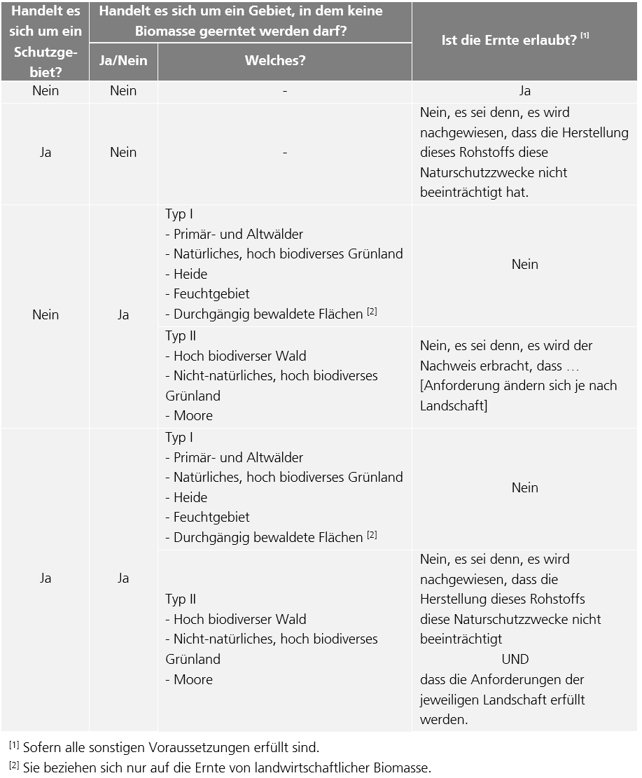 Die Richtlinie (EU) 2018/2001 (RED II), die mit der BioStNachV in nationale Gesetzgebung umgesetzt wurde, hat bereits Flächen mit hoher Biodiversität und hohem Kohlenstoffbestand von der Ernte nachhaltiger Biomasse ausgenommen. Darunter fallen natürliche Grünlandflächen größer ein Hektar mit hohem Wert hinsichtlich der biologischen Vielfalt, neu geschaffene Ackerflächen, Feuchtgebiete, Primärwälder und sonstige naturbelassene Waldflächen. Die Ernte nachhaltiger Biomasse in nicht-natürlichem Grünland mit hohem Wert für die biologische Vielfalt, in Torfmooren, sowie in Schutzgebieten ist unter gewissen Umständen und Auflagen möglich. Der Flächenstatus zum Referenzjahr 2008 spielt hier in vielen Fällen die entscheidende Rolle.