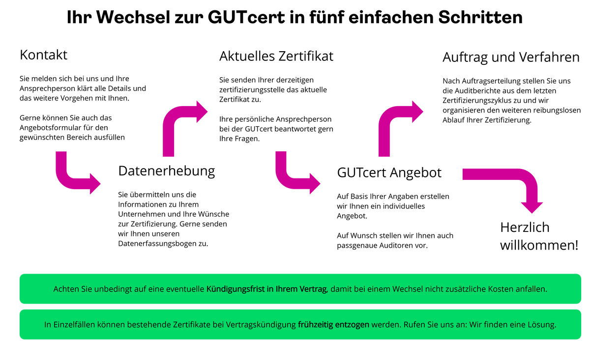 Voraussetzung für den Wechsel zur GUTcert ist eine aktuell gültige Zertifizierung Ihrer Produkte oder Ihres Managementsystems. Zur individuellen Angebotserstellung benötigen wir dafür Ihr aktuell gültiges Zertifikat und Ihre Unternehmensdaten. Sollten Sie sich für die GUTcert als neuen Partner entscheiden, benötigen wir die Berichte der letzten externen Audits. Gerne erläutern wir Ihnen Voraussetzungen für unsere Dienstleistungen auch persönlich.