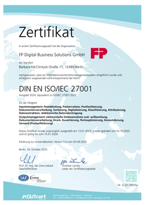 | Standard des Zertifikats | DIN EN ISO/IEC 27001:2024 |