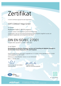 | Standard des Zertifikats | DIN EN ISO/IEC 27001:2024 |