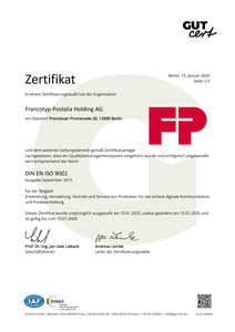 | Geltungsbereich | DE: Entwicklung, Herstellung, Vertrieb und Service von Produkten für die sichere digitale Kommunikation und Postbearbeitung EN: Development, production, sales and service for secure digital communication and mail processing FR: Développement, production, vente et service de produits pour la communication numérique sécurisée et le traitement du courrier |